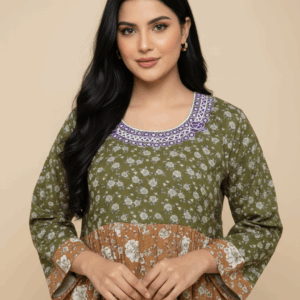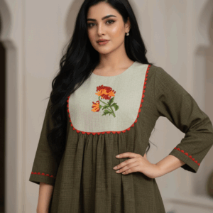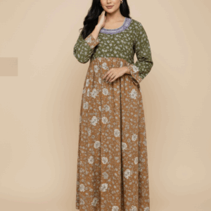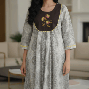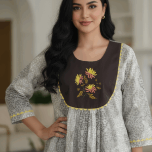 صدرية متباينة: تبرز القطعة بـ صدرية (Yoke) بلون رمادي داكن وتصميم دائري حول الرقبة، مما يمنح إطاراً راقياً يبرز جمال