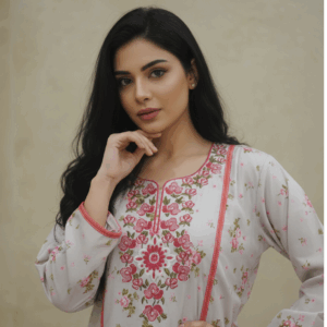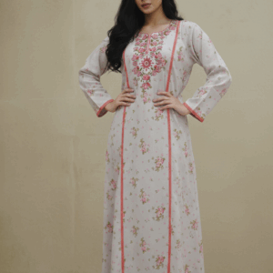 تطريز فاخر: يزدان صدر الجلابية بتطريزات زهرية غنية تدمج درجات متنوعة من اللون الوردي، تتمركز حول فتحة الرقبة لتشكل نقطة