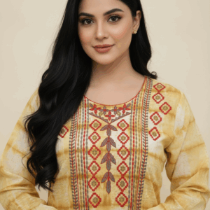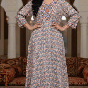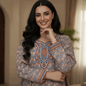 تتميز فتحة الرقبة بتطريز مركزي مُنفذ بدقة متناهية، يمزج بين درجات لون “التيراكوتا” الفخارية، والأوكر الذهبي، والأزرق السماوي. تضفي الزخارف