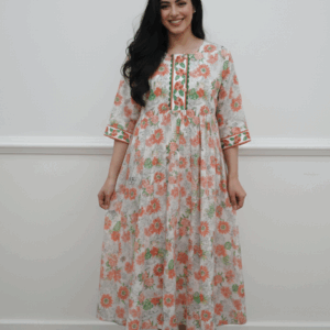 التصميم: طبعة زهور مذهلة تغطي كامل الفستان، تتميز بتفتّح أزهار المرجان الدافئة وأوراق الشجر الخضراء اليانعة على خلفية بيضاء ناصعة.