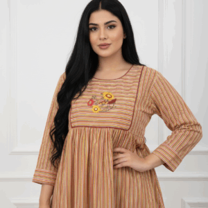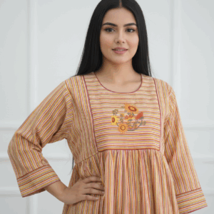 التصميم والنمط: تتميز الجلابية بنمط خطوط عمودية حيوية متعددة الألوان بتدرجات ترابية دافئة (الآجرّي، الخردلي، والكريمي)، مما يمنح قواماً أكثر