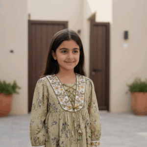 الوصف (Description) يتميز هذا الفستان بنقشة بارزة وناعمة مع قصة فضفاضة وانسيابية تمنح طفلتكِ حرية الحركة. تزدان الجهة الأمامية بتطريز