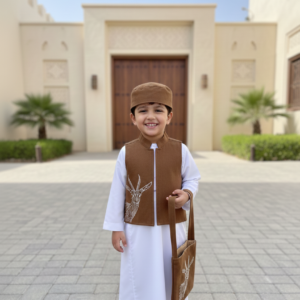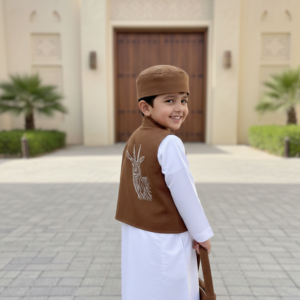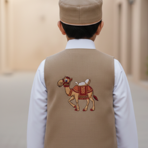 سديري مطرز: سديري مصمم بعناية يتميز بتطريز “جمل” حيوي وكبير على الظهر، مع لمسة مطابقة ناعمة على الصدر. السديري محفوف
