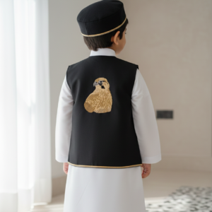 أبرز مميزات المنتج صدرية تقليدية (تصميم بشت): صدرية سوداء أنيقة مزينة بحواف ذهبية وتطريز فاخر على شكل صقر. مصممة لتوفير