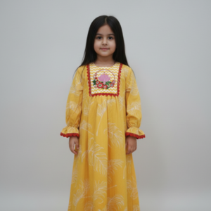 تم تصميم هذه القطعة لتجمع بين الراحة والأناقة، وهي تتميز بنقوش زهور غنية على خلفية باللون الأصفر الخردلي (المستردة) تفيض