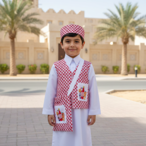 حتويات الطقم: سديري الاحتفالات الفاخر: يتميز بنقشة “الشال” التقليدية باللونين الأحمر والأبيض مع تصميم لف أمامي عصري. السديري مزين برقعة