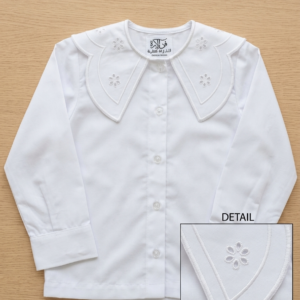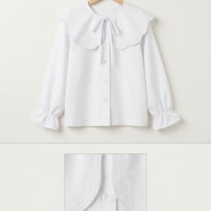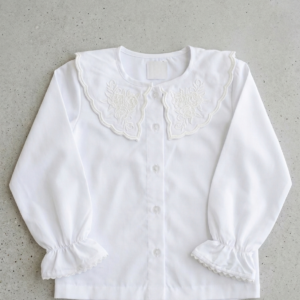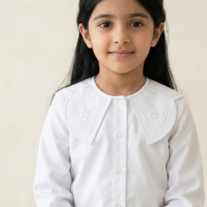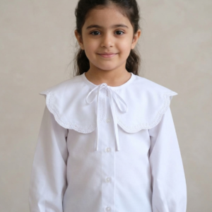 أبرز تفاصيل التصميم: ياقة مميزة: تتميز بياقة “بيتر بان” كبيرة الحجم وجميلة، مزينة بتطريزات ورود رقيقة وأطراف من الدانتيل المتموج.