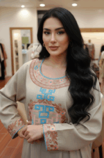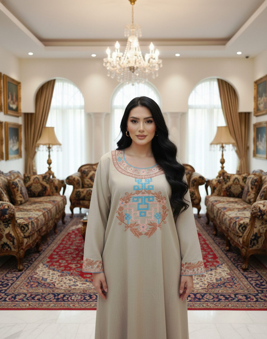 The Jalabiya is beautifully accented by delicate floral embroidery on the central bodice, featuring soft pink and lime green threads