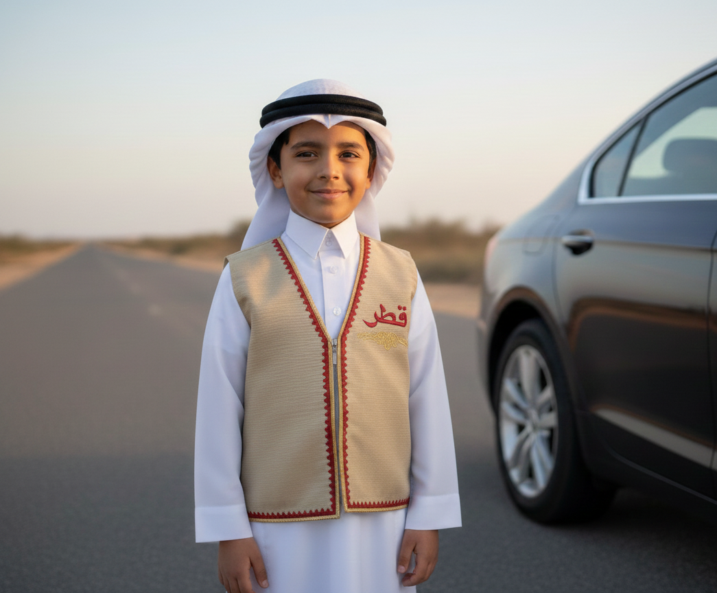 Celebrate Qatari heritage with this beautifully crafted boys’ vest, designed for National Day events, school programs, and cultural celebrations. Made from high-quality fabric, the vest features a grey and yellow tone accented with traditional red edging, giving it a classic and elegant look.
