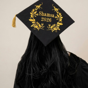 Customized Armani Sash: Elevate your attire with a luxurious sash made from authentic Tafta Armani fabric. This sash features a rich, golden sheen and is professionally customized with your name in beautiful Arabic calligraphy and your graduation year.