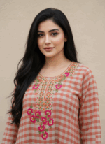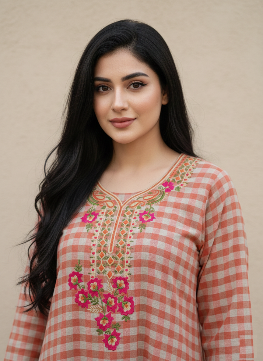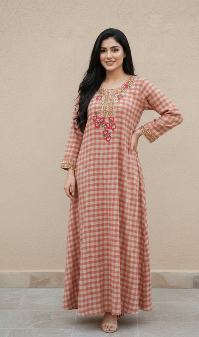 Step into elegance with our Artisan Embroidered Gingham Jalabiya. This piece beautifully marries traditional handcraft with a timeless, modern check pattern, making it a versatile addition to your everyday and semi-formal wardrobe.