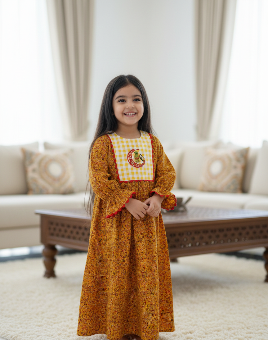 Girls’ Floral Jalabiya with Gingham Bib Accent