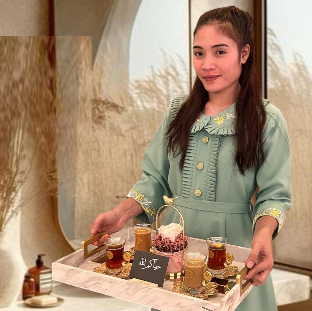 This sophisticated dress is crafted from premium crepe fabric and adorned with delicate gold zari embroidery on the collar and cuffs. Lightweight, elegant, and comfortable, it’s perfect for hospitality, reception, or event service wear—combining classic charm with modern refinement.