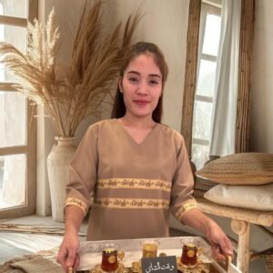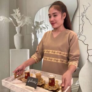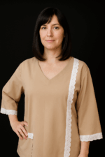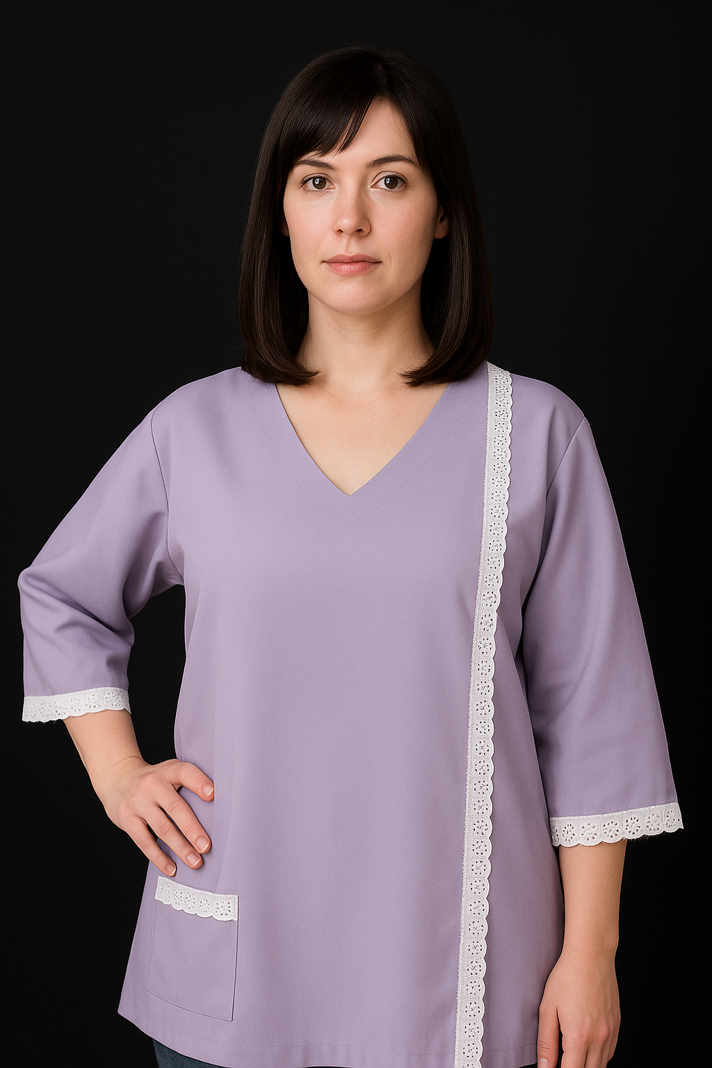 The top features delicate white lace trim along the neckline, sleeves, and front panel, adding a touch of refinement to a practical design. Lightweight and breathable, it allows ease of movement throughout the day. Perfect for daily use in homes, hotels, or cleaning services — combining style and function effortlessly.