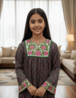 Embellishment: Contrasting White Panel with Pink and Green Rose Embroidery on the neckline and cuffs.