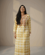 Artisanal Tie-Dye: The fabric features a soft, “leheriya-inspired” horizontal tie-dye effect in shades of mustard and cream, ensuring every piece has a unique, hand-crafted feel.