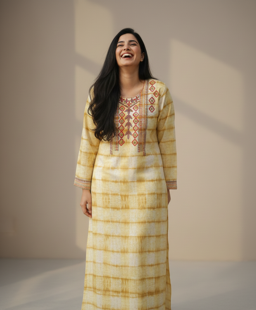 Color: Bright Yellow Design: Long kurta or dress with a slightly flared silhouette. Embellishments: Features detailed embroidery/design around the neckline