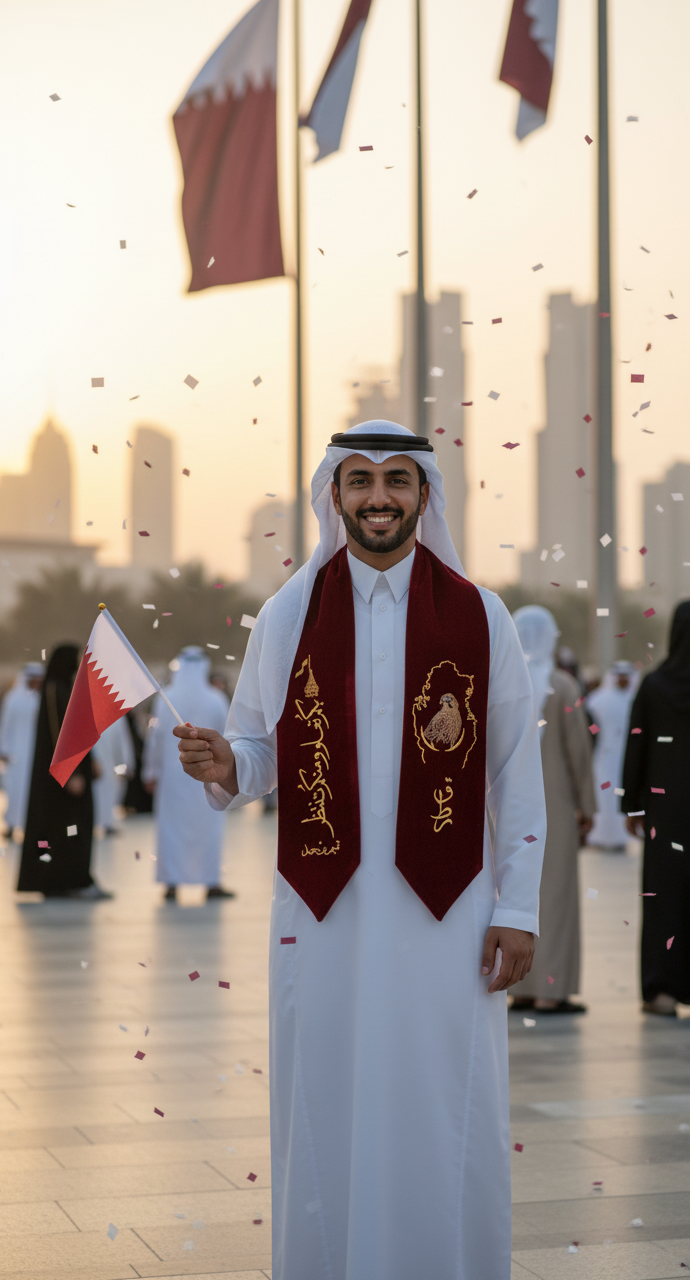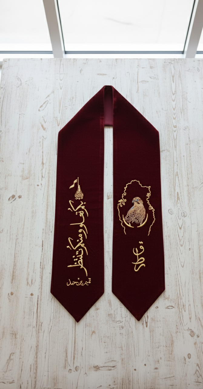 Drape yourself in elegance and national pride with this opulent velvet shawl. Featuring rich, deep maroon velvet and exquisite gold embroidery, this piece is a distinguished way to commemorate Qatar National Day and other significant occasions. The luxurious fabric and detailed cultural designs make it a powerful symbol of identity and sophistication.
