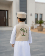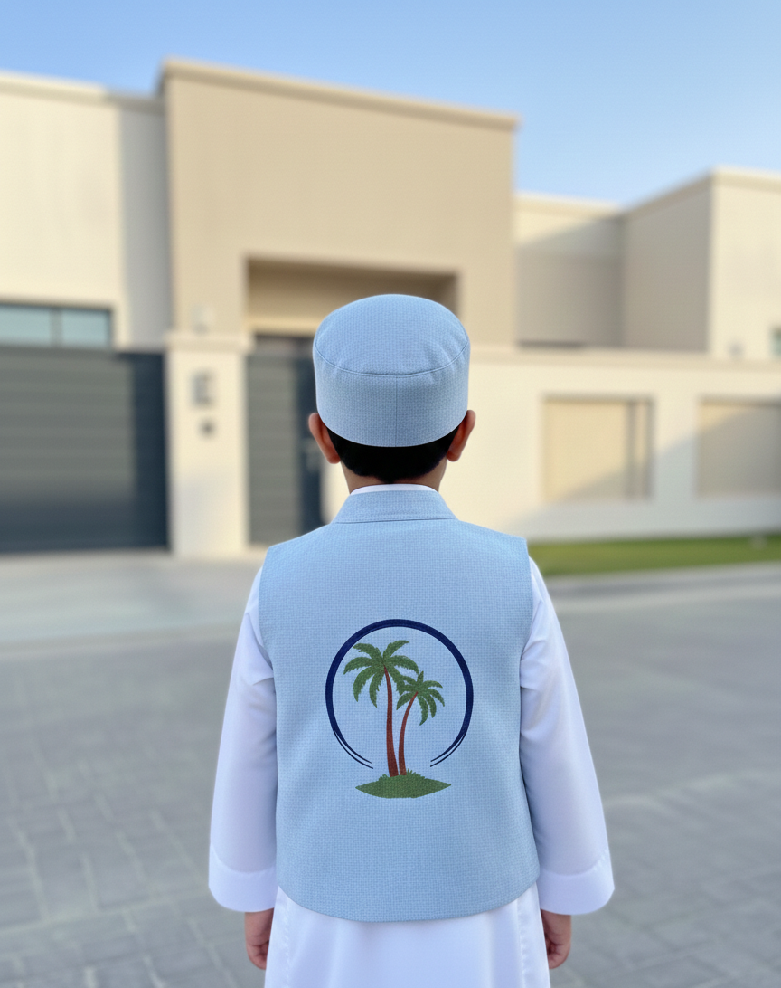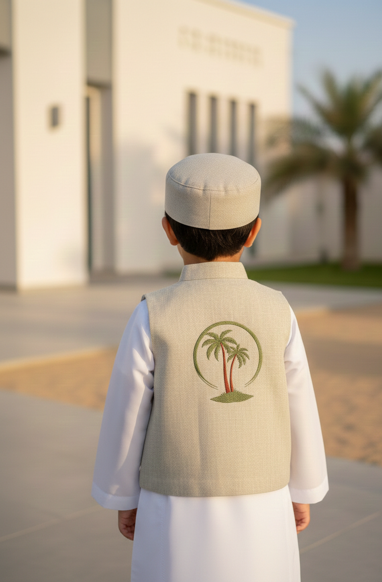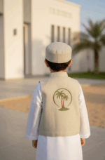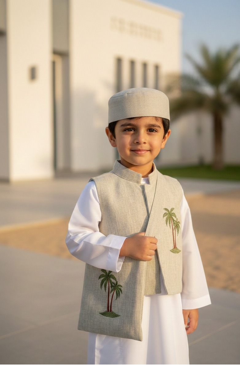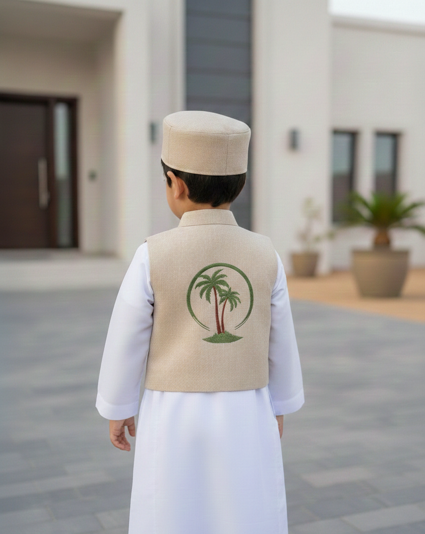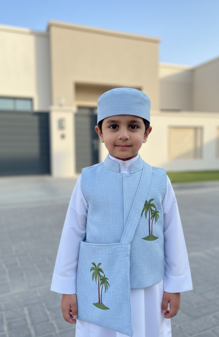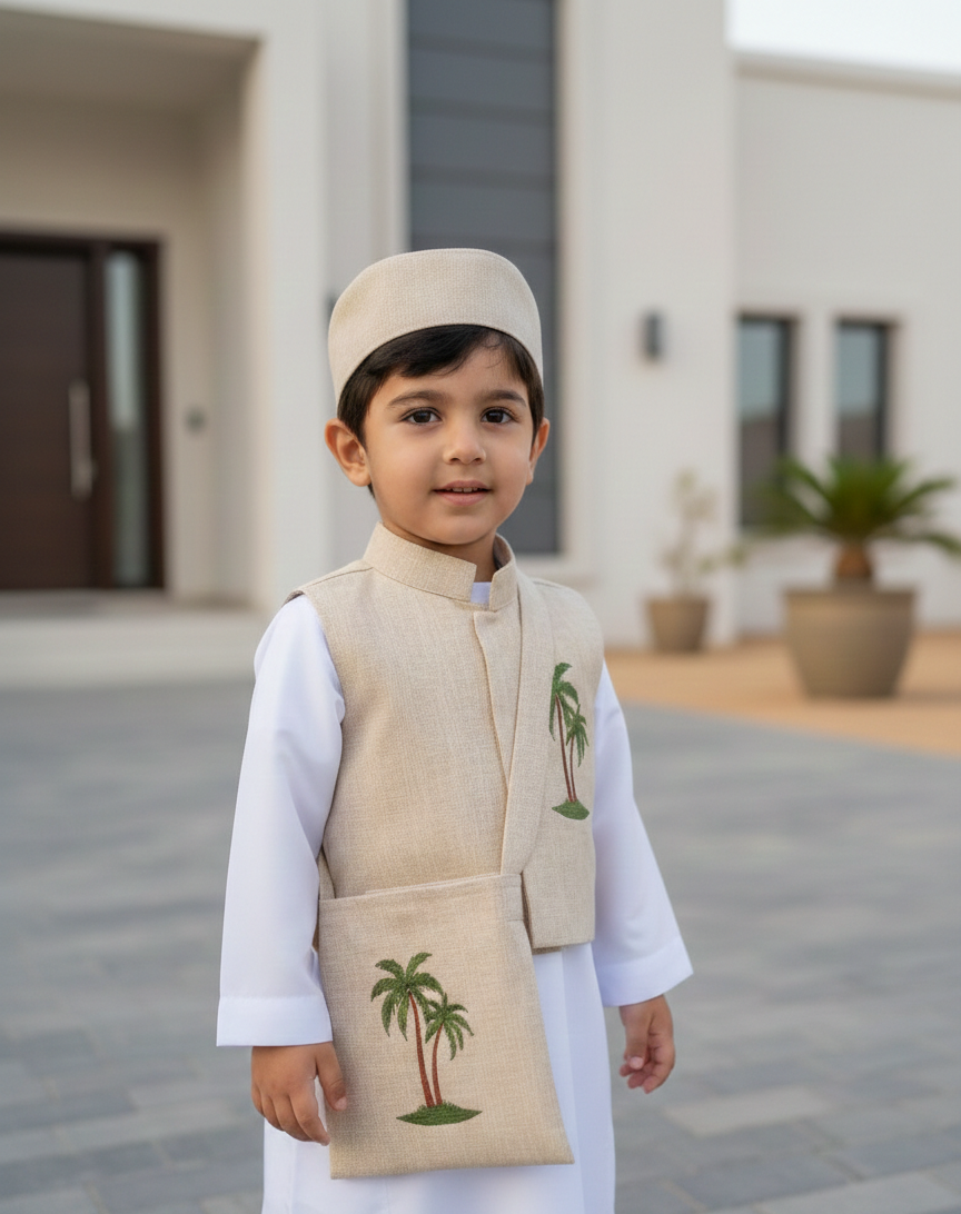 Elevate any simple thobe with our beautifully coordinated 3-piece accessory set. Featuring a classic vest, matching traditional cap, and a coordinated pouch this set is designed to bring a touch of heritage and charm to your little one’s Ramadan or Eid celebrations.