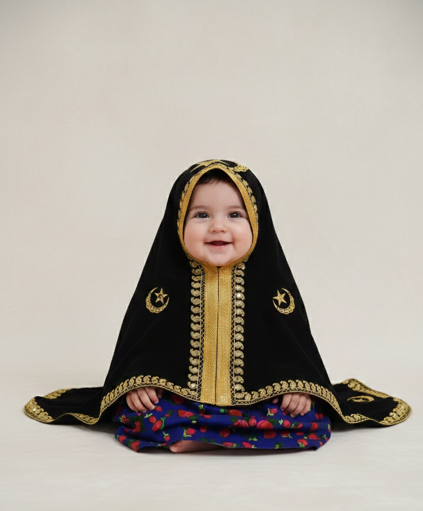 Introduce your little one to the beauty of tradition with our exquisite Gold-Embroidered Chiffon Abaya/Cape. Crafted from premium, lightweight chiffon, this piece offers a graceful drape that is as comfortable as it is stunning.