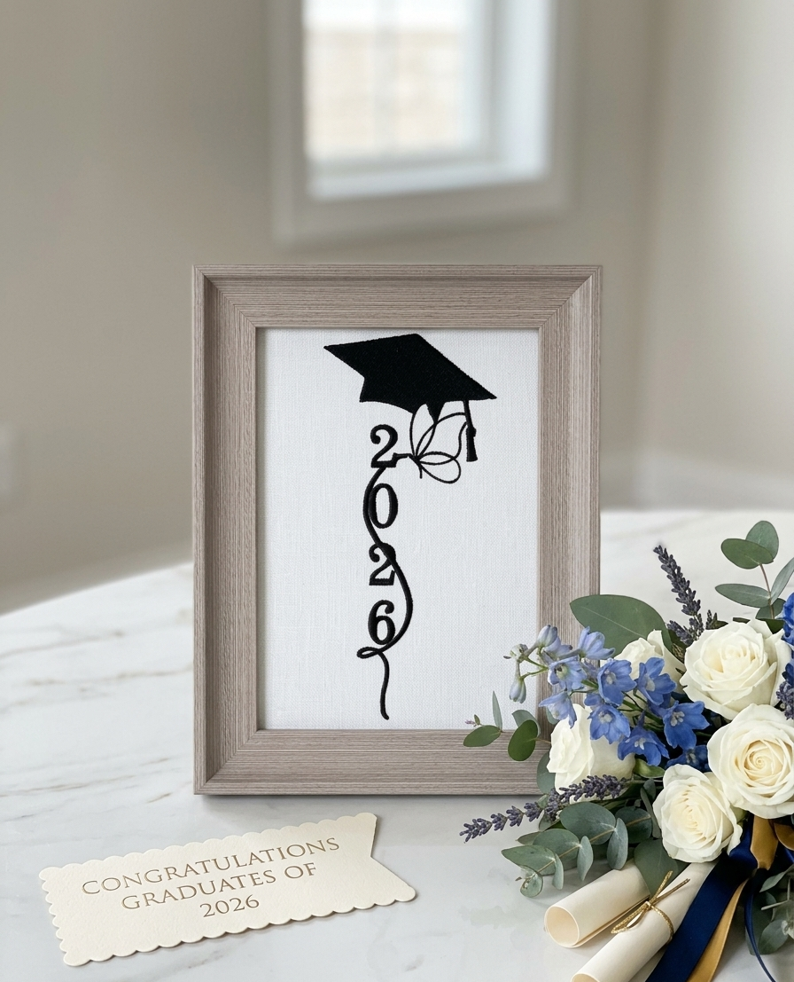 تم تصميم هذه القطعة بعناية فائقة وتفاصيل دقيقة، حيث تتميز بتصميم مطبعي رأسي وأنيق لعام 2026، يزينه من الأعلى قبعة تخرج كلاسيكية وفراشة رقيقة ترمز إلى النمو والبدايات الجديدة.