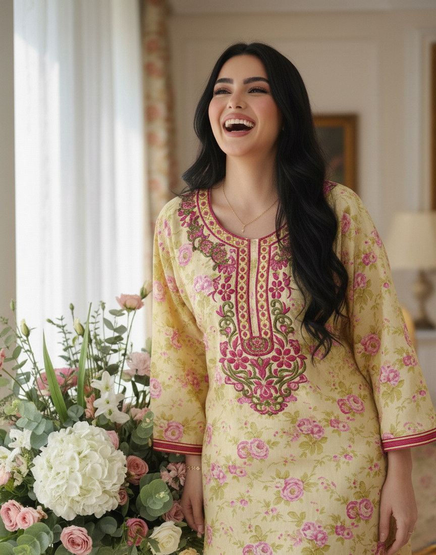 اللون: أصفر ساطع/مشرق (Bright Yellow). التصميم: كورتا طويلة أو فستان بقصة واسعة قليلاً (Slightly Flared Silhouette). التطريز والزخارف: يتميز بـ