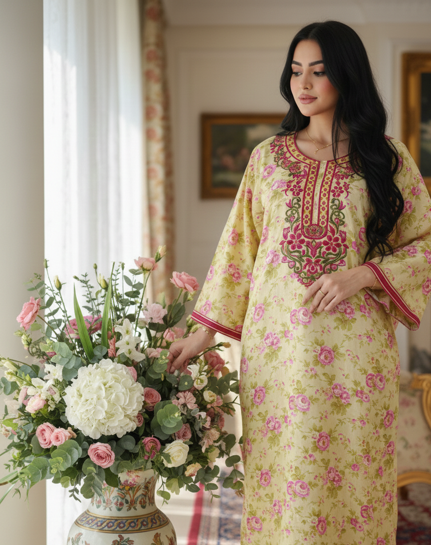 أضيفي لمسة من الألوان الزاهية إلى خزانة ملابسك مع جلابية “مرج الألوان النابض” (Vibrant Meadow Jalabiya). توازن هذه القطعة اللافتة