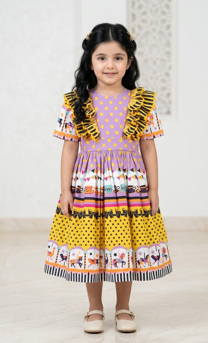 مزج حيوي بين النقشات: يتميز بتصميم فريد يجمع بين “البولكا دوت” باللون اللافندر، والخطوط الصفراء الجريئة، مع حاشية ساحرة مزينة بحيوانات الكاروسيل.