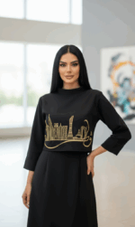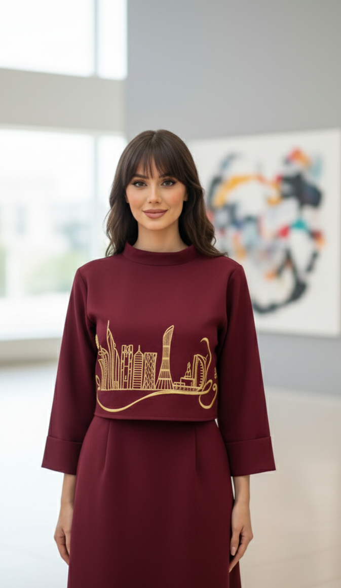 هذا الفستان الراقي يجسّد التوازن المثالي بين الأصالة والأناقة العصرية. يأتي مزوّدًا بسترة قابلة للإزالة مزيّنة بتطريز ذهبي رائع لأفق الدوحة وكلمة “قطر” بخط عربي أنيق — في تجسيد فخور للثقافة والهوية القطرية.