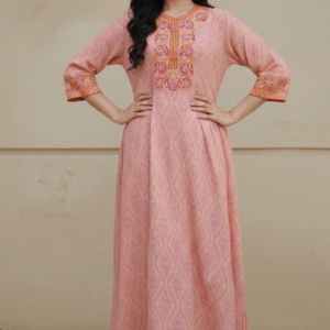 تتميز الجلابية بلمسات جمالية رائعة من التطريز الدائري المتقن على خط العنق، وذلك باستخدام خيوط وردية، وصفراء، وخضراء لمنحها مظهراً