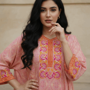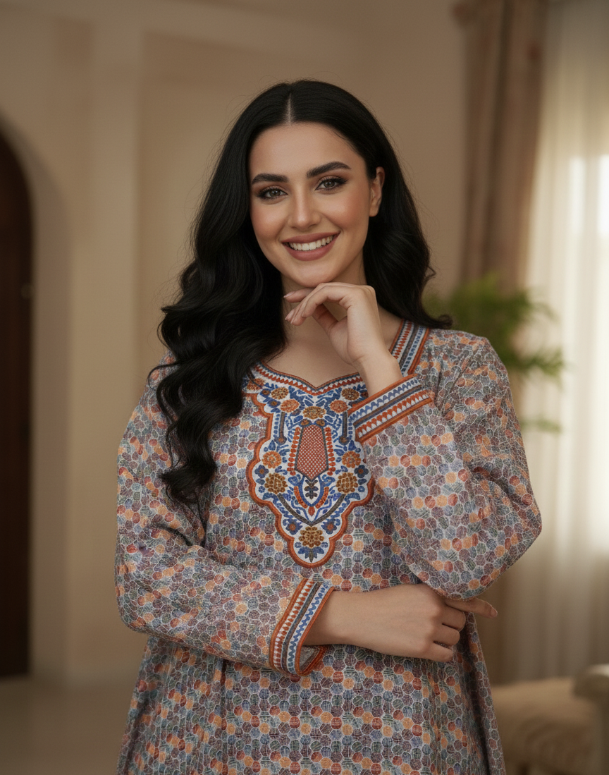 تتميز فتحة الرقبة بتطريز مركزي مُنفذ بدقة متناهية، يمزج بين درجات لون “التيراكوتا” الفخارية، والأوكر الذهبي، والأزرق السماوي. تضفي الزخارف النباتية والهندسية المتداخلة لمسة راقية تجذب الأنظار وتعمل كمركز جمالي للتصميم.