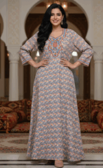 جلابية/قفطان مريح: القَصَّة الفضفاضة والمنسدلة توفر راحة استثنائية وانسيابية جذابة تناسب الجميع، مع تخصير خفيف عند الجانبين لشكل محدد وأنيق.