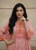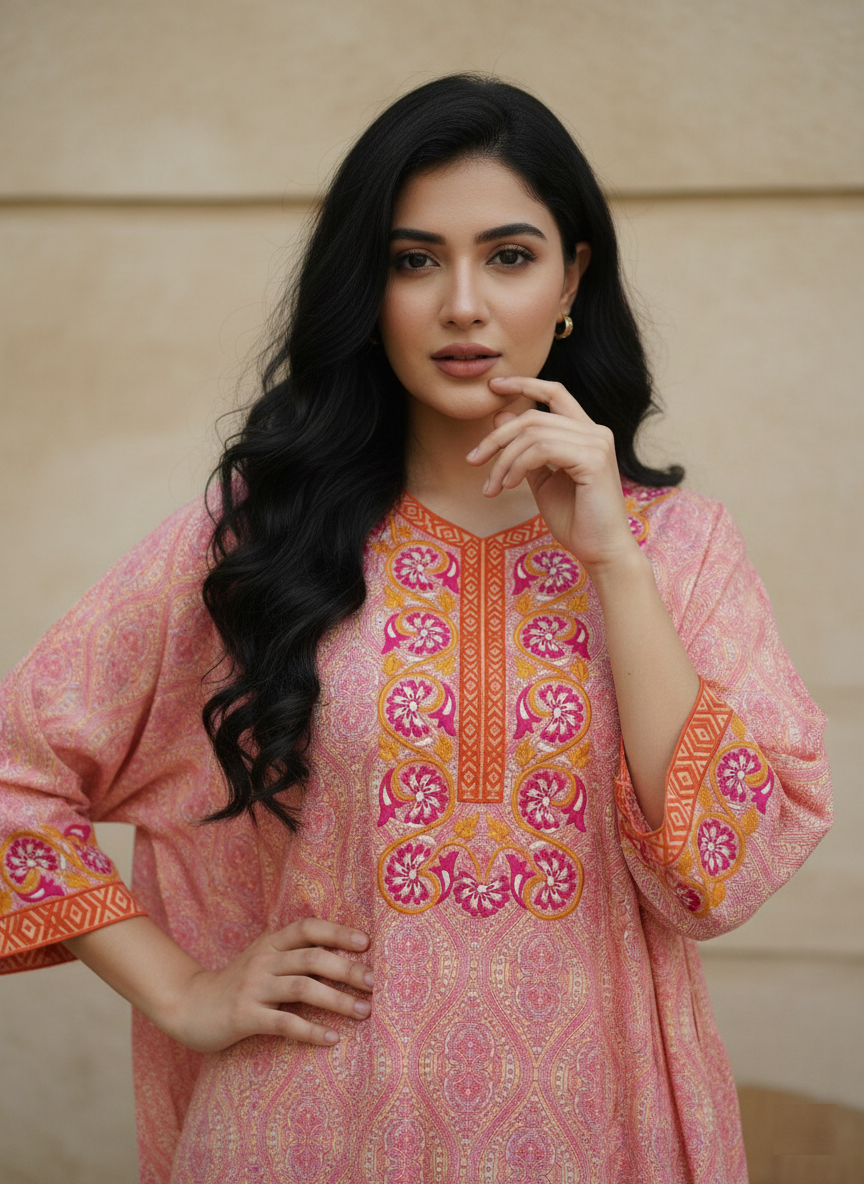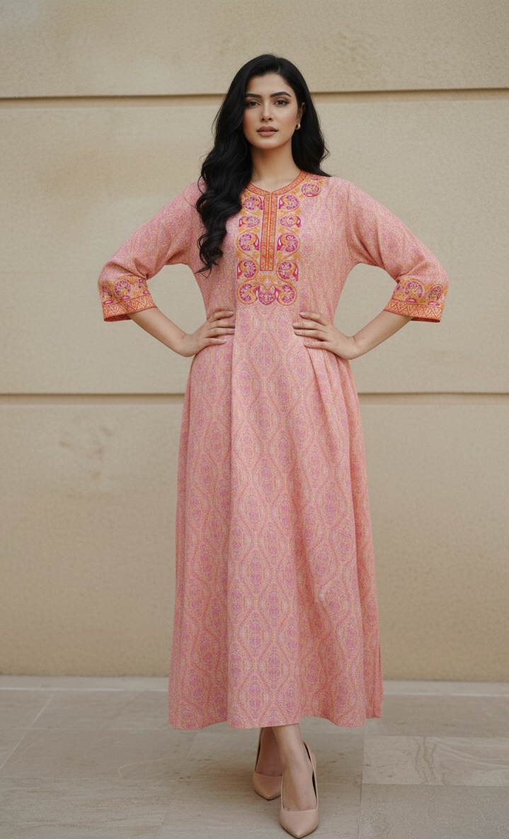 قماش أساسي فاخر: يتميز القفطان بلون أساسي رائع هو الوردي المائل للذهبي / الوردي المغبر، ومطبوع بنقوش ذاتية خفيفة من زخارف البيزلي (Paisley) الرقيقة والمنسجمة في اللون.
