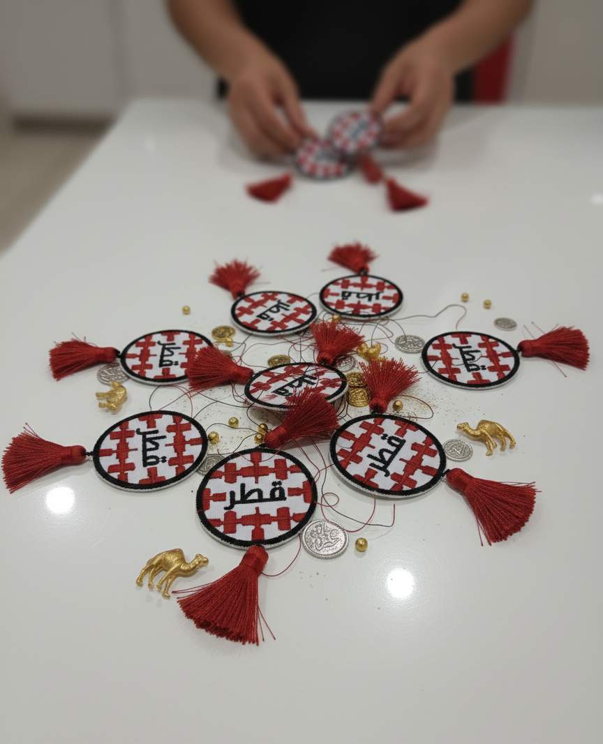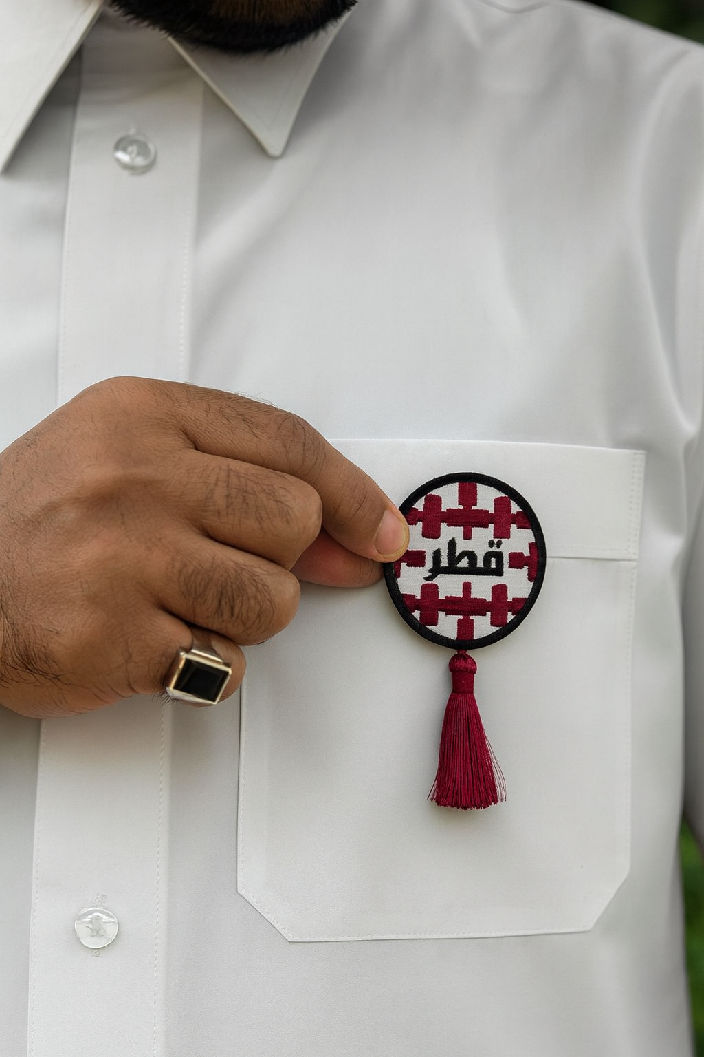 ارتقِ بإطلالتك في اليوم الوطني مع شارة قطر المطرّزة، المصممة لإضافة لمسة وطنية راقية إلى أي ثوب أو زي. تتميز الشارة بتصميم دائري مزدان بنقوش تقليدية باللونين المارون والأبيض، وتحمل كلمة “قطر” مكتوبة بخط عربي أنيق.