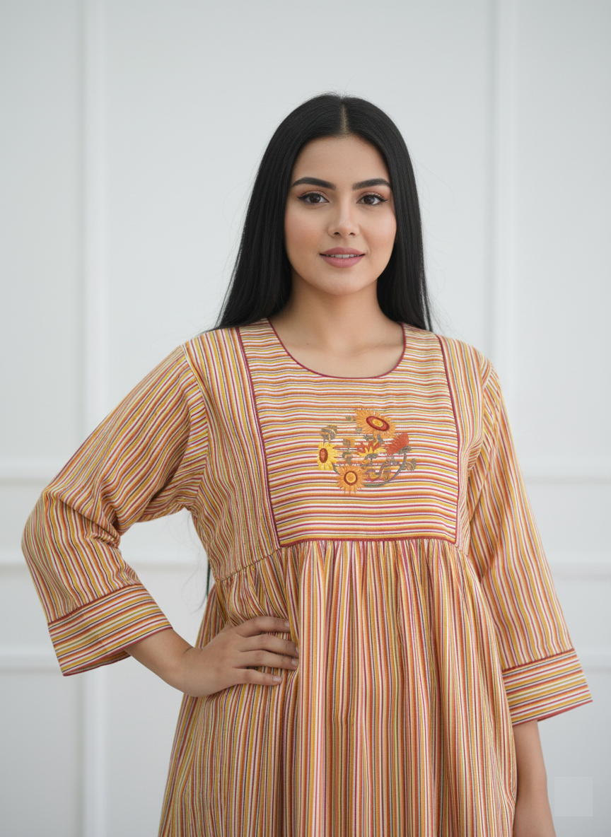 التفاصيل الفنية: يبرز صدر الجلابية بلوحة مستطيلة محددة بخطوط أفقية متباينة، تتوسطها تطريزات زهرية متقنة مستوحاة من عباد الشمس بألوان صفراء وصدئية غنية.