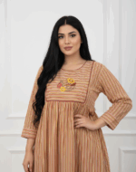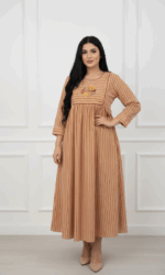 التصميم والنمط: تتميز الجلابية بنمط خطوط عمودية حيوية متعددة الألوان بتدرجات ترابية دافئة (الآجرّي، الخردلي، والكريمي)، مما يمنح قواماً أكثر رشاقة ومظهراً طويلاً وأنيقاً.