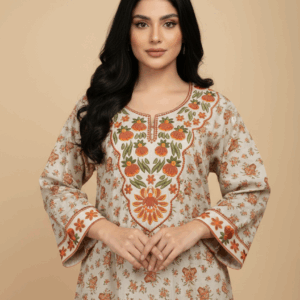 لتطريز اليدوي المتقن: القطعة المحورية هي الياقة الأخاذة التي تتميز بتطريز يدوي غني ومفصّل بزخارف نباتية وأوراق شجر بألوان البرتقالي
