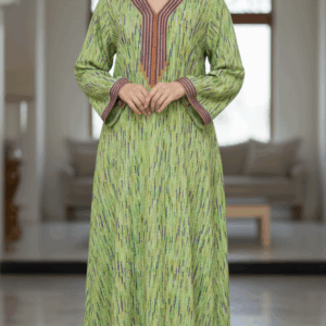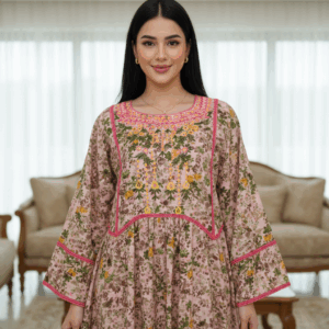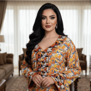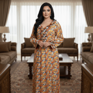 أدلي ببيان حيوي مع جلابية “زهرة الصحراء” (Desert Bloom). هذه القطعة هي احتفال بالألوان، وتتميز بطبعة فنية فريدة وتفاصيل غنية