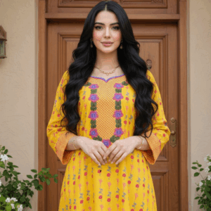 اللون: أصفر ساطع/مشرق (Bright Yellow). التصميم: كورتا طويلة أو فستان بقصة واسعة قليلاً (Slightly Flared Silhouette). التطريز والزخارف: يتميز بـ