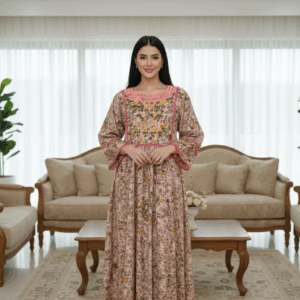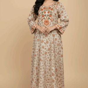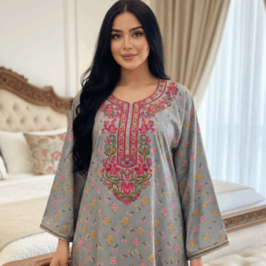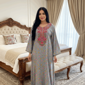 تتوفر هذه الجلابية الأنيقة المزينة بنقشة الزهور الآن بلون جميل آخر، مع الحفاظ على نفس التصميم الكلاسيكي بلمسة جديدة وعصرية. صُنعت من قماش خفيف ومريح، وتتميز بنقشة زهرية ناعمة تغطي كامل القطعة وتضفي إحساسًا بالرقة والجاذبية.