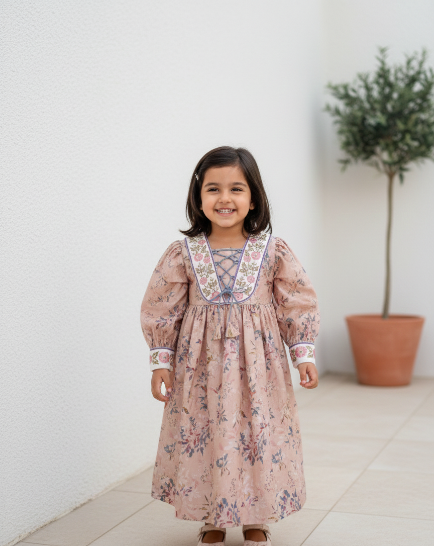تزيّن فتحة الرقبة على شكل حرف V تطريزات زهرية دقيقة، مع رباط أمامي يمنح إمكانية التعديل ولمسة أنيقة. كما تأتي بأكمام طويلة مزينة بأساور مطرزة متناسقة، ويبرز الخصر المجمع برفق قصة انسيابية أنثوية تناسب الارتداء اليومي أو المناسبات الهادئة.