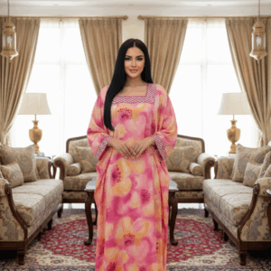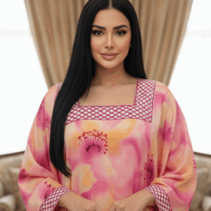 نعمي بقمة الرقي والراحة مع هذه الجلابية المائية (Watercolor Jalabiya) الأخاذة، التي تتميز بمزيج حالم من الألوان الدافئة المستوحاة من