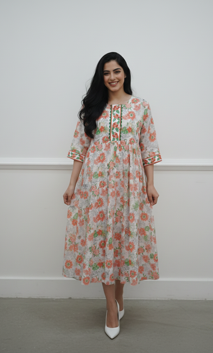 التصميم: طبعة زهور مذهلة تغطي كامل الفستان، تتميز بتفتّح أزهار المرجان الدافئة وأوراق الشجر الخضراء اليانعة على خلفية بيضاء ناصعة.