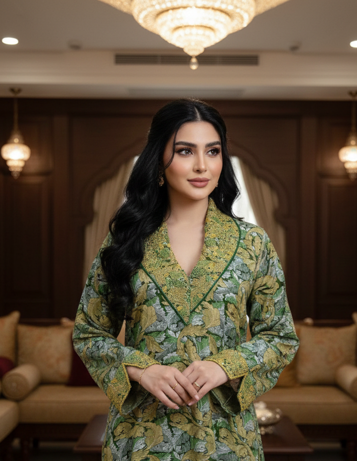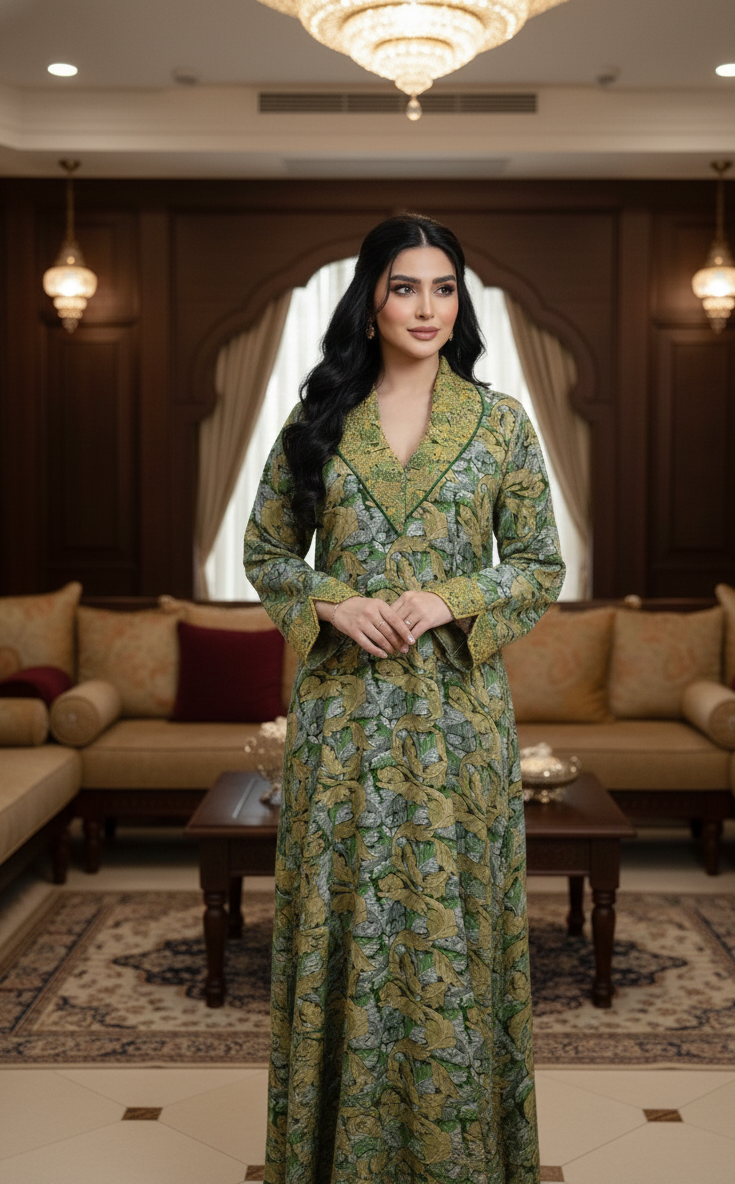 اختبري الفخامة الحقيقية والروعة المطلقة مع جلابية “عظمة الغابة” (Forest Majesty). هذه القطعة هي تحفة فنية في التصميم، حيث تتميز بطبعة نباتية غنية وتطريز مذهل مطعم بالخرز المصنوع يدوياً. إنها الخيار الأمثل للمناسبات الرسمية، والاحتفالات، ولإطلالة فخمة وراقية لا مثيل لها.