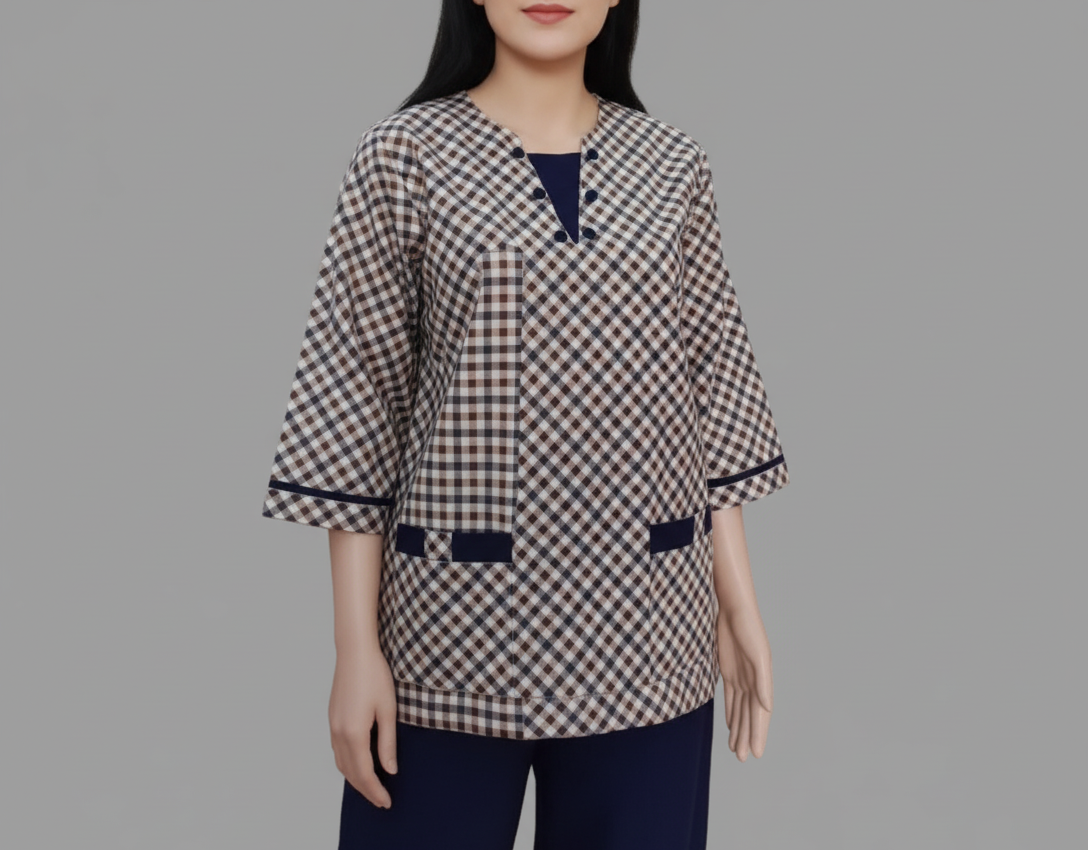 تونيك كاروهات بتصميم متقن: يتميز بنقشة “جينهام” كلاسيكية (مربعات ميكرو) باللونين البيج والكحلي، مع قصة طويلة (Longline) تمنحك قواماً متناسقاً وتغطية إضافية.