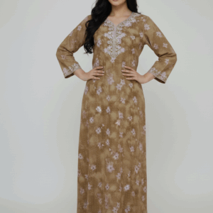 لسمة الرئيسية في هذه الجلابية هي التطريز الزهري الكثيف والمتعدد الألوان والمذهل، الذي يحيط بفتحة العنق المستديرة ويمتد على طول