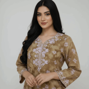 لتطريز المتقن: النقطة الأبرز هي التطريز المفصّل والجميل الذي يزين خط العنق والأصفاد. الخيوط الرقيقة بلون أرجواني فاتح / ليلكي