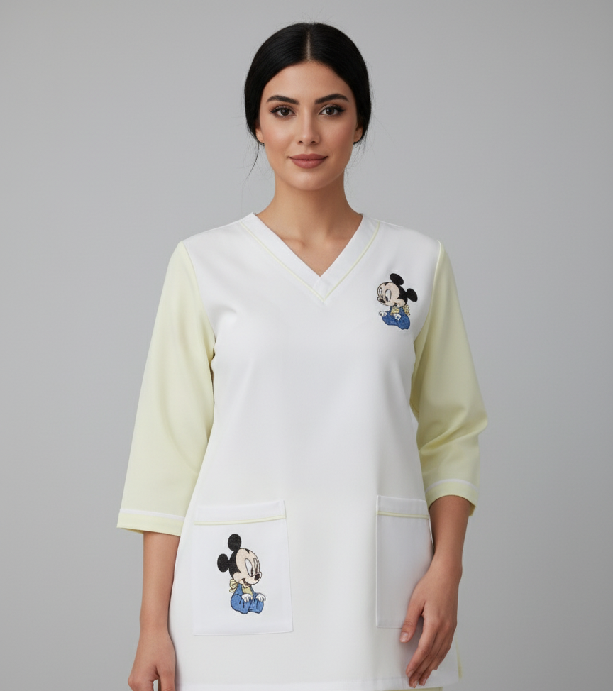 أضف لمسة من الدفء والبهجة إلى خزانة ملابسك المهنية الخاصة برعاية الأطفال مع طقم المربية المصنوع من الكريب بتصميم ميكي ماوس. صُمم هذا الطقم خصيصاً للمربيات ومحترفي دور الحضانة، حيث يجمع بين الجمالية المرحة والمظهر الأنيق والمهني الذي يساعد في بناء علاقة وثيقة فورية مع الأطفال.