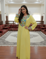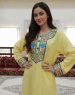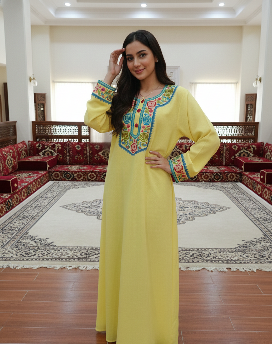 لسمة الرئيسية في هذه الجلابية هي التطريز الزهري الكثيف والمتعدد الألوان والمذهل، الذي يحيط بفتحة العنق المستديرة ويمتد على طول فتحة الصدر الأمامية. يستخدم التصميم خيوطاً غنية باللون الأزرق السماوي، والوردي الداكن، والأخضر الزيتوني لإحداث تباين جميل مع اللون الأصفر. كما تُزين الأكمام بحافة مطرزة مطابقة، مما يضمن مظهراً متكاملاً وراقياً.