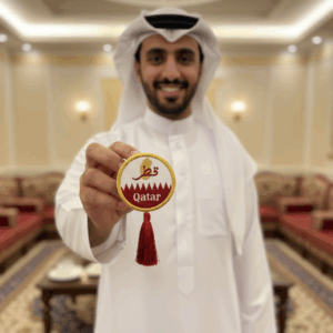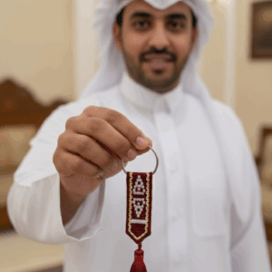 تطريز تذكاري: يتميز بتطريز عالي الجودة لهلال ونجوم ذهبية تحيط بعبارة “رمضاني الأول” (My First Ramadan) في المنتصف.
